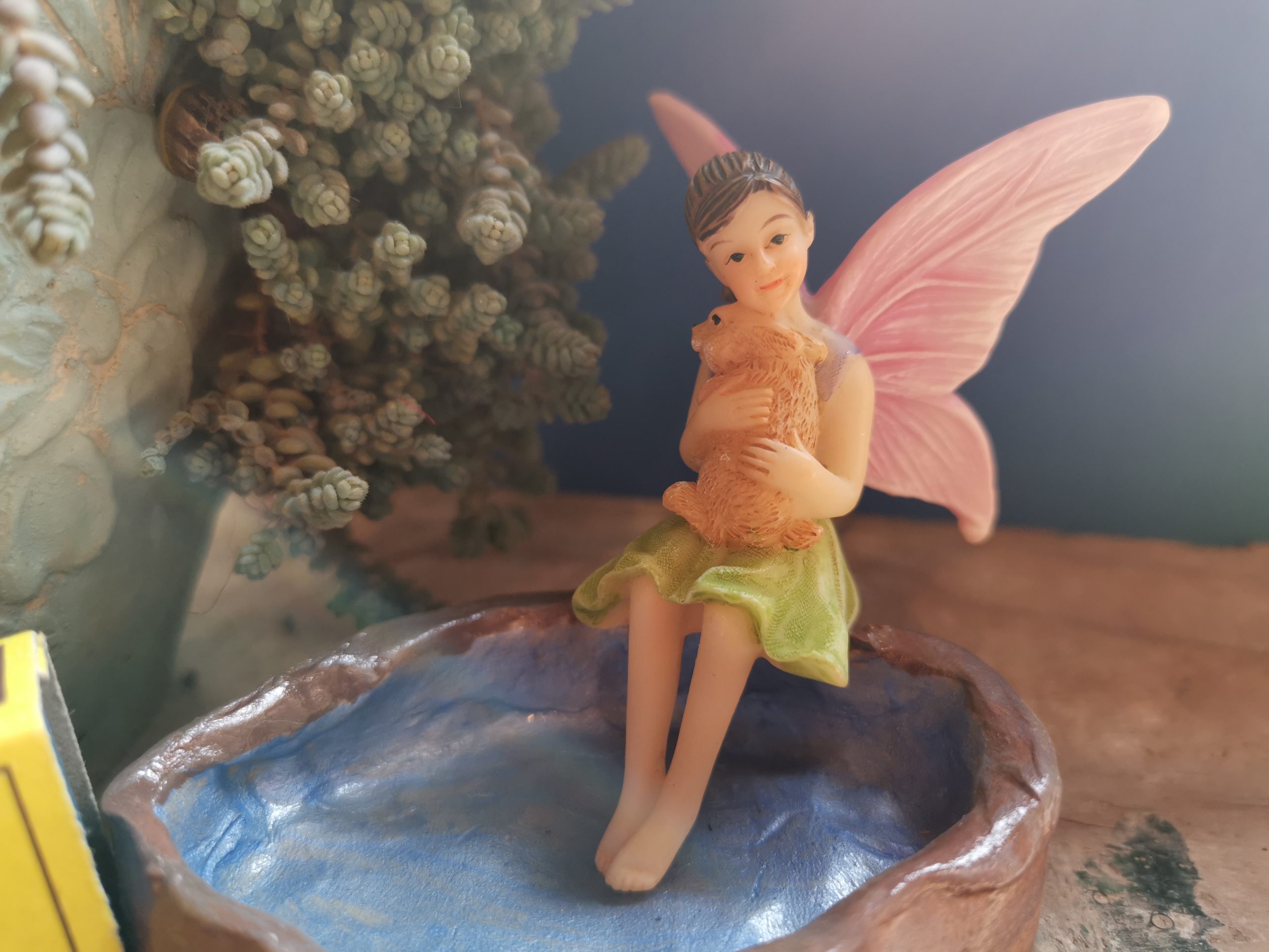 Beautiful Fairy (Green) sitting with Bunny to add to your Miniature collection.