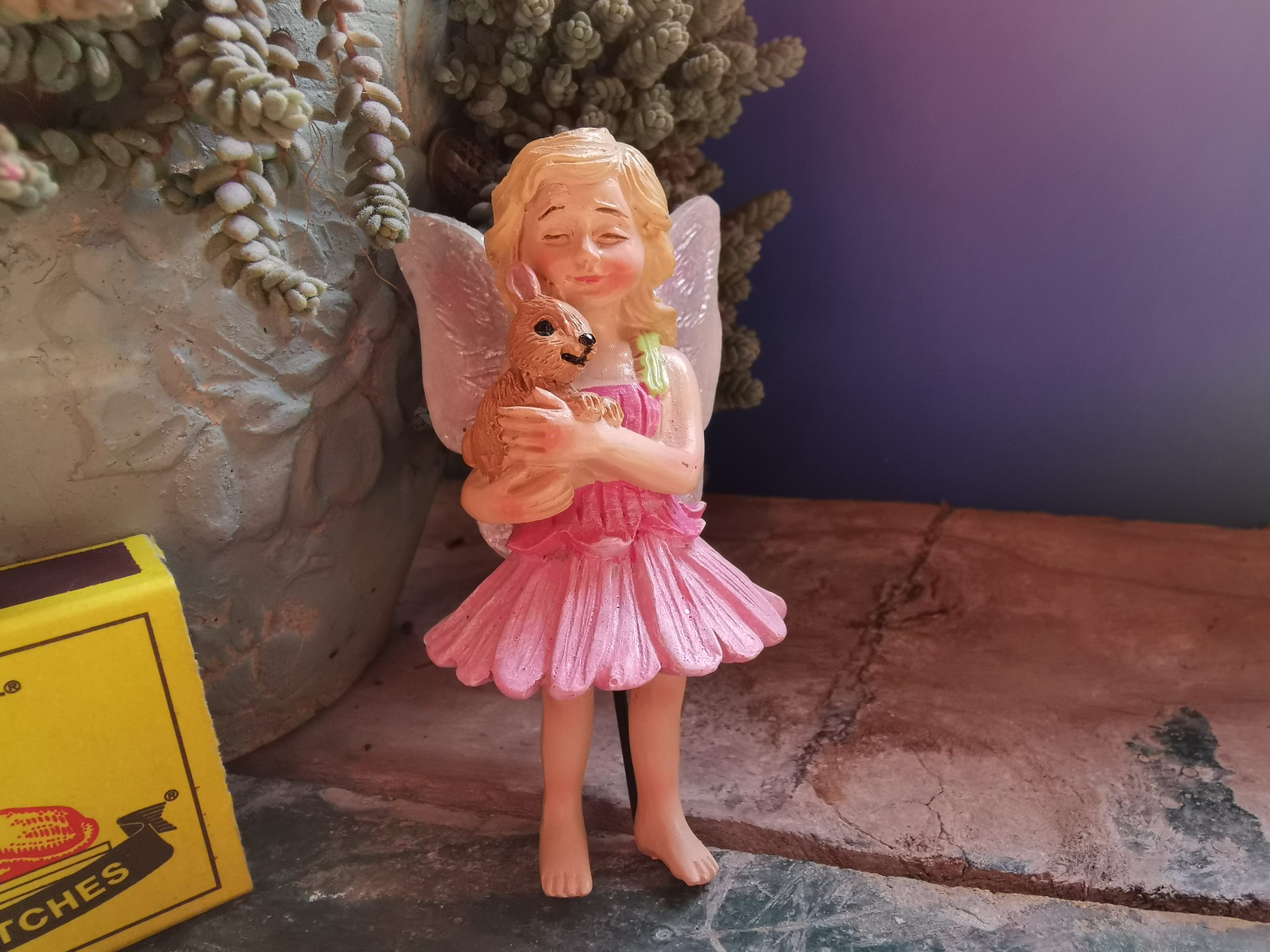 Beautiful Fairy (Pink) holding Bunny on stake to add to your Miniature collection.