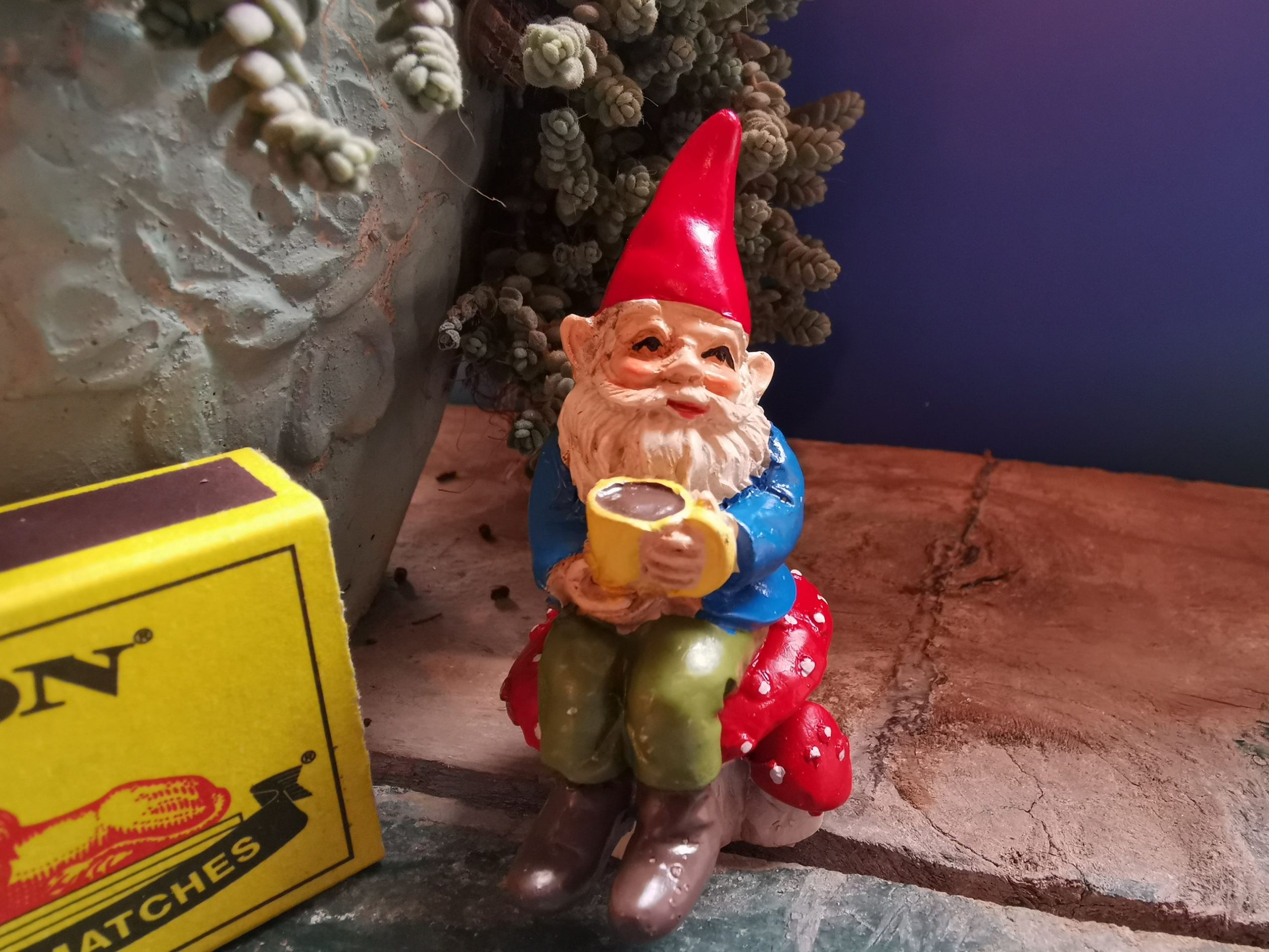 Beautiful Gnome with Coffee on stake to add to your Miniature collection.